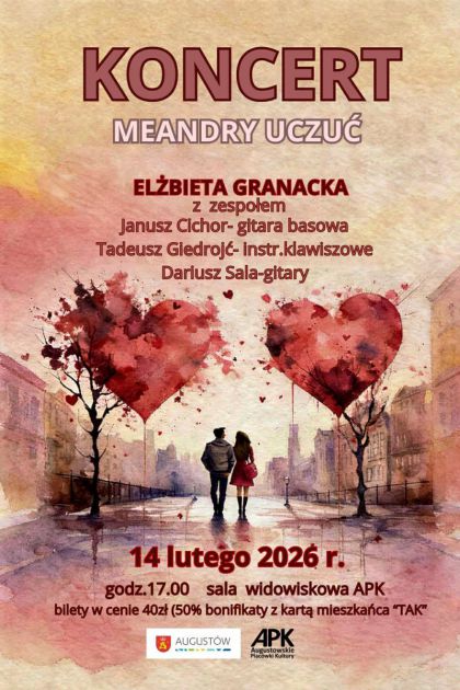 W sobotę 14 lutego 2026 w sali widowiskowej Miejskiego Domu Kultury (Rynek Zygmunta Augusta 9, wejście od ul. Kościelnej II piętro) o godz. 17:00 rozpocznie się wydarzenie, w którym zaprezentuje się Elżbieta Granacka oraz jej grający przyjaciele: Janusz Cichor (gitara basowa), Tadeusz Giedrojć (in (...)