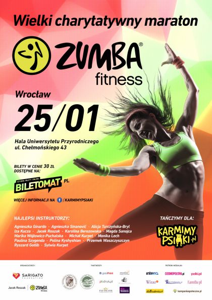 Lubisz aktywność fizyczną? Chcesz w ciekawy sposób spalić poświąteczne kilogramy? A może po prostu zrobić pierwszy noworoczny dobry uczynek? Nie ważne czym się kierujesz, ważne że możesz pomóc! Weź udział w ogólnopolskim MARATONIE ZUMBY, podczas którego zebrane fundusze zostaną przeznaczone na akcję KarmimyPsiaki.pl. Tylko sobie wyobraź: dziesiątki uczestników, profesjonalni instruktorzy, świetna muzyka, fantastyczna atmosfera – i podwójna motywacja, dla siebie i dla innych. Połącz przyjemne z pożytecznym – pierwszy Maraton Zumby we Wrocławiu już 25 stycznia w godzinach 16-19 na Hali Uniwersytetu Przyrodniczego!