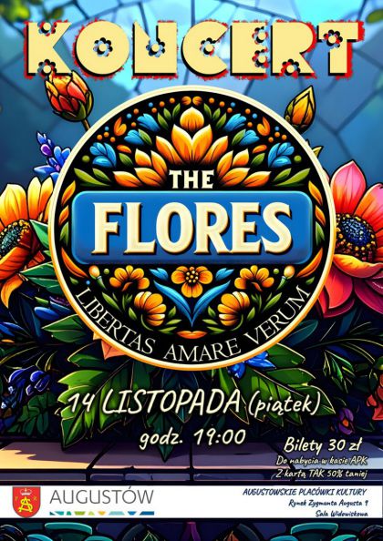 Augustowskie Placówki Kultury serdecznie zapraszają w piątek 14 listopada 2025 roku o godz. 19:00 do Sali widowiskowej MDK (Rynek Zygmunta Augusta 9, wejście od ul. Kościelnej II piętro) na koncert augustowskiego zespołu The Flores!