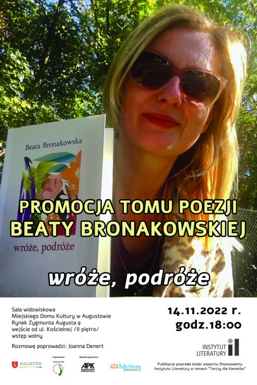 Augustowskie Placówki Kultury oraz Fundacja „Słowo i Obraz”, w imieniu autorki – Beaty Bronakowskiej, zapraszają na promocję tomiku poetyckiego pt. „Wróże, podróże”. Spotkanie autorskie odbędzie się 14 listopada 2022 r. o godz. 18.00 w Sali widowiskowej Augustowskich Placówek Kultury, Rynek Zygmunta Augusta 9 (wejście od ul. Kościelnej, II piętro). Z Beatą Bronakowską porozmawia Joanna Denert.