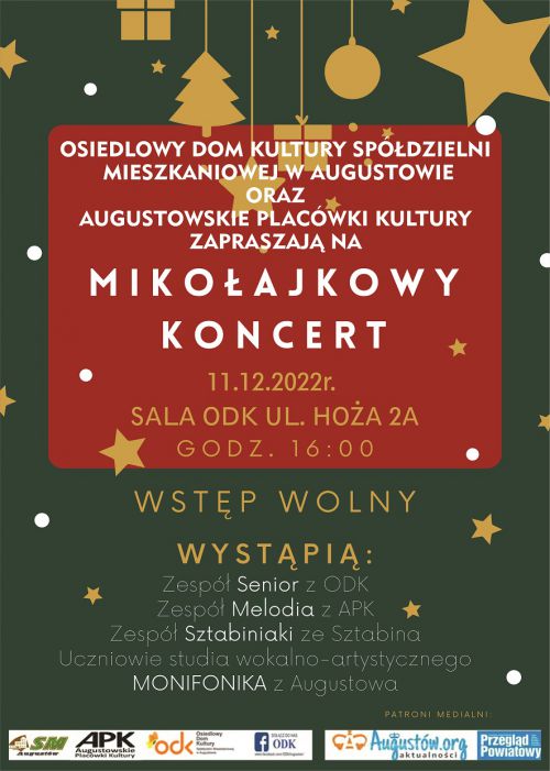 Augustowskie Placówki Kultury oraz Osiedlowy Dom Kultury Spółdzielni Mieszkaniowe w Augustowie serdecznie zapraszają w niedzielę 11 grudnia 2022r. do Osiedlowego Domu Kultury SM (ul. Hoża 2a), gdzie o godz. 16:00 rozpocznie się koncert zespołów „Melodia” (APK) , „Senior” (ODK), „Sztabinianki” ze Sztabina oraz Uczniowie studia wokalno-artystycznego „MONIFONIKA” z Augustowa.