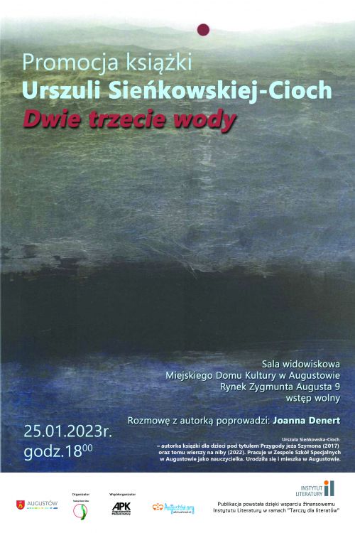 Augustowskie Placówki Kultury oraz Fundacja „Słowo i Obraz”, w imieniu autorki – Urszuli Sieńkowskiej-Cioch, zapraszają na promocję tomiku poetyckiego pt. „Dwie trzecie wody”. Spotkanie autorskie odbędzie się 25 stycznia 2023 r. o godz. 18.00 w sali widowiskowej Augustowskich Placówek Kultury, Rynek Zygmunta Augusta 9 (wejście od ul. Kościelnej, II piętro). Z Urszulą Sieńkowską-Cioch porozmawia Joanna Denert.