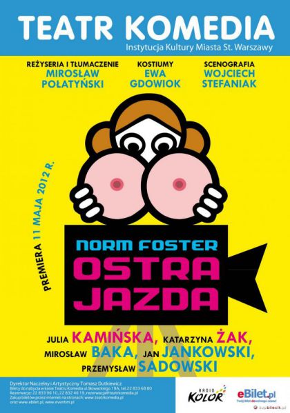 Do czego zdolni są ludzie z dnia na dzień pozbawieni pracy? Do czego zdolni są ludzie, którzy nienawidzą swej pracy? Wreszcie, do czego zdolni są ludzie, którzy przebywają w towarzystwie pozbawionych i nienawidzących pracy? Niestety, chyba do wszystkiego. Nawet do tego, aby porzucić utarte koleiny znanej, bezpiecznej oraz akceptowalnej społecznie rodzinnej codzienności i rzucić się w nieznane i mroczne objęcia showbiznesu - Nieco roznegliżowanego showbiznesu? No dobrze, bądźmy szczerzy - zupełnie nagiego showbiznesu. Cóż, właściwie - pornobiznesu. Dalej już tylko może być śmiesznie. Nawet bardzo śmiesznie. Bohaterowie "Ostrej jazdy" poprzez udział w niefortunnej przygodzie z kinem niezupełnie familijnym przeżyją niezwykłe emocjonalne wstrząsy i prawdziwe duchowe rozterki. Jednak konieczność zmierzenia się z nagą rzeczywistością - momentami w sensie dosłownym - pozwala im spojrzeć na siebie i na ludzi wokół w zupełnie inny niż dotychczas sposób. Pozwala im poznać nagą prawdę o przepraszam, po prostu prawdę o sobie. I popaść w kolejne tarapaty, tyle tylko, że tym razem miłosne? "Ostra jazda"to brawurowa komedia Norma Fostera z nieoczekiwaną pointą i znakomitą obsadą - Katarzyna Żak, Julia Kamińska, Mirosław Baka, Jan Jankowski i Przemysław Sadowski. Nagość jeszcze nigdy nie była tak śmiesznie ubrana jak w naszej najnowszej prapremierze !