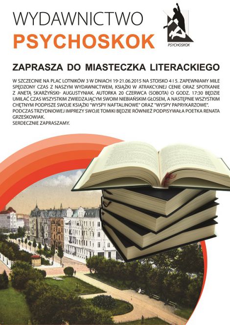 Wydawnictwo Psychoskok zaprasza do Miasteczka Literackiego w Szczecinie w dniach 19-21 czerwca 2015 r. na Plac Lotników. Ta trzydniowa impreza to dla miłośników literatury po raz kolejny okazja do zapoznania się z naszą ofertą wydawniczą, zakupu dobrych książek po okazyjnej cenie, ale to także możliwość spotkania ulubionych pisarzy. Nasze stoisko zaszczyci swą obecnością wspaniała śpiewaczka, malarka i oczywiście pisarka Aneta Skarżyński. W dniu 20 czerwca o godzinie 17:30 autorka powieści „Wyspy Naftalinowe” oraz „Wyspy Paprykarzowe” będzie miała swój koncert na scenie w Miasteczku Literackim, a po występie czytelnicy będą mieli okazję porozmawiać z tą wspaniałą osobowością, a także zakupić jej książki by zdobyć autograf. Serdecznie zapraszamy na stoisko Psychoskoku. Czekamy tam na Ciebie nasz drogi czytelniku.