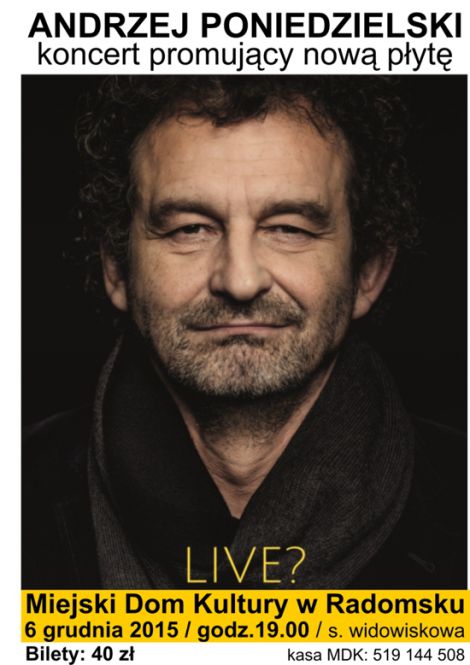 6 grudnia o godz. 19.00 na muzycznej scenie MDK wystąpi Andrzej Poniedzielski. Podczas koncertu, znakomity muzyk i satyryk będzie promować swoją najnowszą płytę LIVE?.