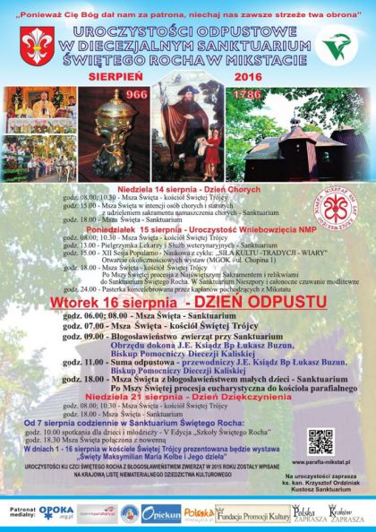 16 sierpnia wspomina się w kościele Świętego Rocha. To wielki dzień dla niewielkiej mikstackiej wspólnoty parafialnej ( diecezja kaliska). W tym dniu przeżywa ona uroczystości odpustowe ku czci Świętego Rocha w Diecezjalnym Sanktuarium. Na uroczystości odpustowe przyjeżdżają pielgrzymi i turyści z różnych stron kraju. Przybywają do Mikstatu, by przeżyć niezwykłe, niespotykane uroczystości odpustowe połączone z obrzędem błogosławieństwa zwierząt. Co warto podkreślić, odbywają się one tu nieprzerwanie od trzystu lat. Mieszkańcy miasteczka wierzą i tę wiarę w sposób skuteczny przekazują z pokolenia na pokolenie, że to właśnie orędownictwu Świętego Rocha ich przodkowie zawdzięczają ocalenie w czasie nawiedzających często te okolice epidemii cholery.