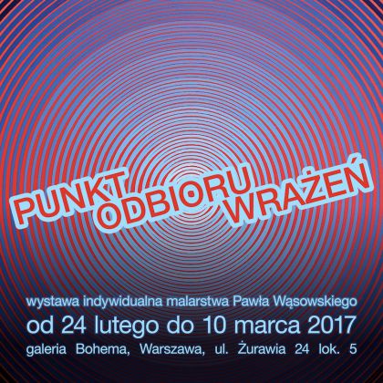 Zapraszamy na pierwszą indywidualną wystawę Pawła Wąsowskiego, która jest równocześnie pierwszą wystawą w nowej siedzibie Bohemy przy ul. Żurawiej. Razem z Pawłem otwieramy „Punkt Odbioru Wrażeń” - nowe miejsce na mapie Warszawy dla spragnionych doznań estetycznych. Nazwa wystawy podkreśla najważniejsze składniki sztuki Wąsowskiego - obrazy artysty składają się bowiem z setek idealnie dopracowanych, umieszczonych na płótnie punktów, które razem dają niesamowite efekty optyczne. Obrazy powstają poprzez systematyczne i mozolne nakładanie kolejnych warstw kolorów w celu uzyskania efektu optycznego, który nie zawsze jest zamierzony. Mimo, że skończony obraz uderza precyzją wykonania, proces twórczy ma zawsze charakter eksperymentalny. Punkty, kolory, kontrasty zdają się żyć własnym życiem, a artysta nadaje im ostateczny kierunek. Malarstwo Wąsowskiego „odrobiło lekcje” u mistrzów op-artu, wyciągnęło z nich wnioski i dalej podąża spokojnie w poszukiwaniu własnych środków artystycznego wyrazu.