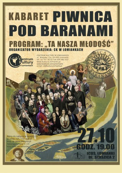 Krakowska Piwnica pod Baranami zawita w końcu października do Łomianek, aby dostarczyć nam niepowtarzalnych wrażeń na wyjątkowym koncercie.