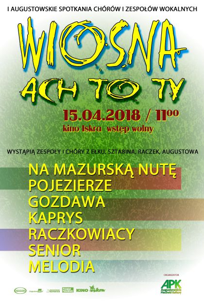 Augustowskie Placówki Kultury serdecznie zapraszają na I Augustowskie Spotkania Chórów i Zespołów Wokalnych „Wiosna, ach to ty!”, które odbędą się w niedzielę 15 kwietnia od godziny 11:00 w augustowskim kinie „Iskra”. Podczas wspólnego koncertu wiosnę przywitają zespoły: Na Mazurską Nutę, Pojezierze, Gozdawa, Kaprys, Raczkowiacy, Senior i Melodia.