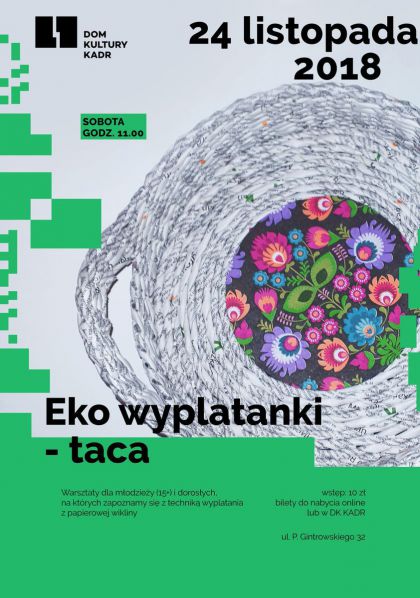 Na warsztatach zapoznamy się z techniką wyplatania z papierowej wikliny. Jest to forma kreatywnego recyklingu makulatury. Używając papierowej wikliny możemy stworzyć niepowtarzalne przedmioty użytku codziennego. Uczestnicy warsztatów zapoznają się z podstawami techniki papierowej wikliny, zobaczą przykładowe przedmioty wykonane tą techniką, dowiedzą się jak utrwalać dowolne formy oraz otrzymają komplet przygotowanych papierowych rurek. Na warsztatach każdy z uczestników wykona własnoręcznie okrągłą tacę, którą zabierze do domu.