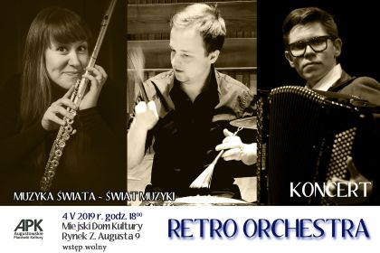 4 maja 2019 o godz. 18:00 – Koncert „Muzyka Świata – Świat Muzyki” w wykonaniu Retro Orchestry na scenie Miejskiego Domu Kultury przy Rynku Zygmunta Augusta 9 wystąpi trio w składzie Piotr Kopietz (akordeon, kierownictwo artystyczne), Agnieszka Rogowiecka (flet), Rafał Kozyra (instrumenty perkusyjne) i zaprezentują się Państwu w nieczęsto spotykanym i niezwykle ciekawym brzmieniowo składzie instrumentalnym oraz różnych nurtach stylistycznych. W programie m.in.: W. Szpilman „W małym kinie”, W. Siemionow „Suita bułgarska”, J.S. Bach „Siciliana” z „Sonaty fletowej”, R. Galliano „La valse a'Margaux”, A. Piazzolla „Oblivion”, L. Spence „Nice 'n' Easy”.