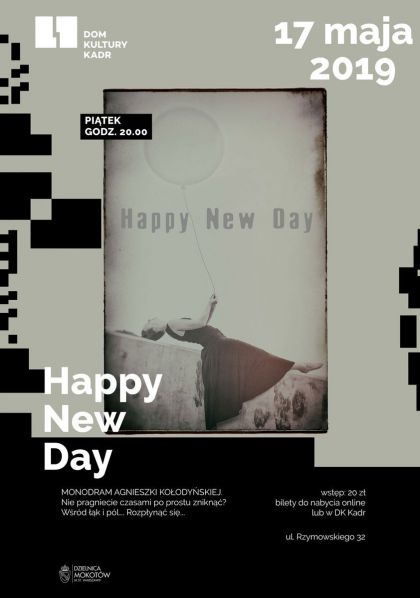 Aktorka wkracza na scenę z wielką misją. Chce stworzyć “Happy New Day”, szczęśliwy nowy dzień, chwilę, od której będziemy patrzeć na świat inaczej. Z wielką wrażliwością i jeszcze większą ironią opowiada o otaczającym nas świecie. Nakreśla obraz człowieka – malkontenta, niepotrafiącego cieszyć się życiem, cierpiącego na “psychosomatyczną kurwicę egzystencjalną”. Dostrzega potrzebę zmiany tego nastawienia, jednocześnie wyśmiewając cud-metody, które mają sprawić, że na świat będziemy patrzeć przez różowe okulary. Szczęścia nie dadzą przecież śpiewające i wywijające nóżkami maskotki, nie da go lot w kosmos dla wybrańców losu, nie można też sprowadzić go do kolorowego rysunku: słoneczka, chmurki, kwiatka, serduszka. By nas o tym przekonać, sięga po całą gamę rozwiązań scenicznych. Są, więc piosenki, ckliwe opowiastki o trudnym dzieciństwie, czy talk show przypominający terapię. Mimo tak różnorodnych konwencji, artystka ani na moment nie traci kontroli nad spektaklem. Znakomicie odnajduje się we wszystkich wcieleniach, przez cały czas utrzymuje świetny kontakt z widzami. Swoją barwną osobą wypełnia całą przestrzeń, w zależności od charakteru sceny zmieniając elementy scenografii i kostiumu.