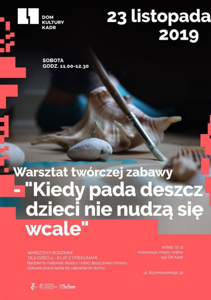 Zapraszamy dzieci w wieku od 4 do 6 lat wraz ze swoimi opiekunami na warsztat “Kiedy pada deszcz dzieci nie nudzą się wcale”. Będziemy malować deszcz i robić deszczowe chmury. Gotowe prace będą do zabrania do domu.