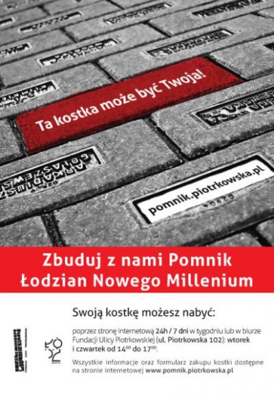 Na stronie www.pomnik.piotrkowska.pl ruszyła sprzedaż 9300 granitowych kostek z imionami i nazwiskami lub nazwami Fundatorów. Zostaną one ułożone na ul. Piotrkowskiej w Pomnik Łodzian Nowego Millenium - kontynuację istniejącego Pomnika Łodzian Przełomu Tysiącleci.