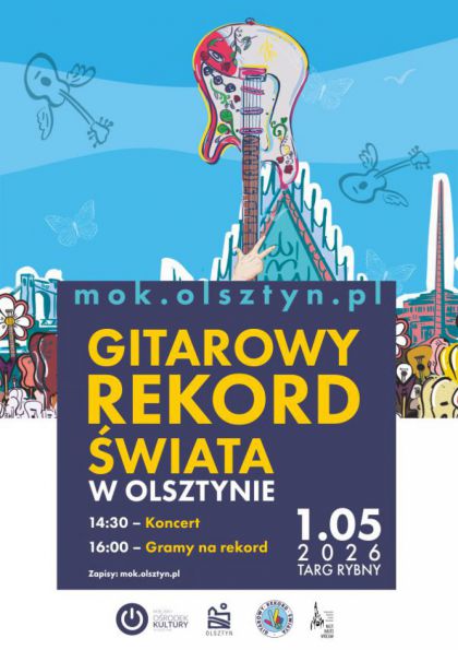 MOK Olsztyn zaprasza do wspólnego bicia 🎸 Gitarowego Rekordu Świata 🎸! W Olsztynie próba pobicia go odbędzie się w piątek 1 maja na Targu Rybnym.
