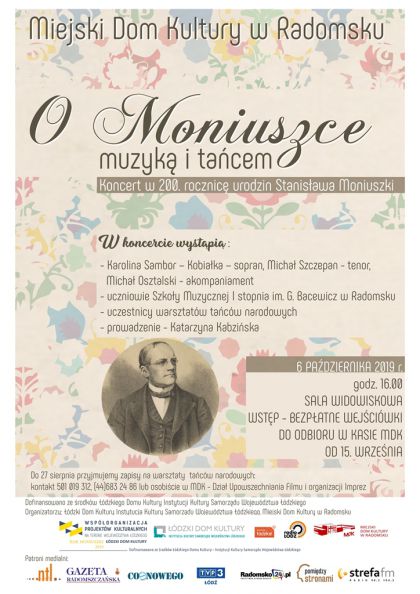 Zapraszamy do udzia³u w projekcie O Moniuszce muzyk¹ i tañcem, który realizowany jest w ramach wspó³organizacji projektów kulturalnych zwi¹zanych z obchodami roku Moniuszki w województwie ³ódzkim w 2019 r.